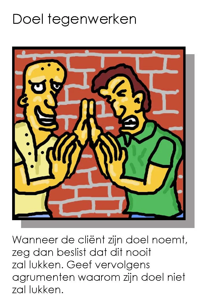 Dit stukje motivatie was ook een groot onderdeel van mijn master. Er zijn veel theorieën over motivatie, zoals de Theory of Reasoned Action en de Theory of Planned Behavior. Deze leggen de nadruk op subjectieve normen (hoe gedragen anderen zich), zelf-effectiviteit (je kunnen) en waargenomen controle (mijn actie zal leiden tot de gewenste uitkomst). Volgens de provocatieve methode ga je niet aanmoedigen dat iemand zijn doel zal behalen door zijn actie, maar doe je het tegenovergestelde. Zoals een van de plaagkaarten van Vendl zegt: wanneer de ander zijn doel noemt, zeg dan beslist dat dit nooit zal lukken en waarom. Je moedigt iemand dus juist niet aan, waardoor iemand in de war raakt en gaat beargumenteren waarom het wel gaat lukken!